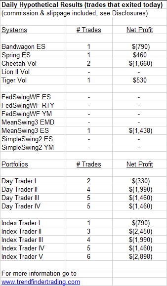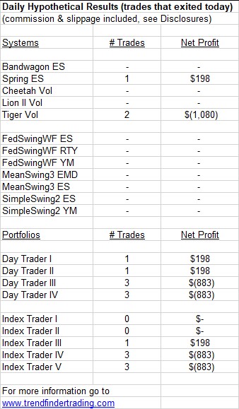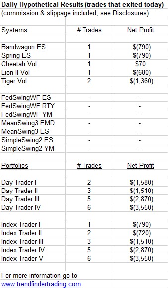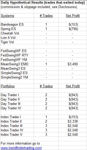 Bandwagon ES and Spring ES each had a short trade. MeanSwing exited a short trade in the EMD (S&P MidCap 400).