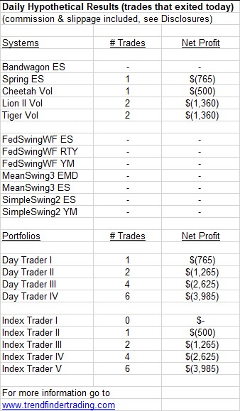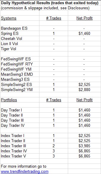 Four intraday systems had a long trade. MeanSwing3 ES (S&P 500) exited a short trade.